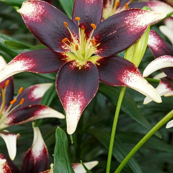 Asiatic lilies are perfect for bedding. thanks to their sturdy. upright stems and reliable growth. Slightly fragrant. they produce elegant blooms that bring vibrant colour to summer gardens. This variety features striking deep purple. almost black flowers. each tipped with pure white for dramatic contrast. Ideal for borders. containers. or mixed plantings. these lilies make a bold statement while remaining easy to grow. Their upright habit and eye-catching flowers ensure they stand out. adding both sophistication and seasonal interest to any garden display.