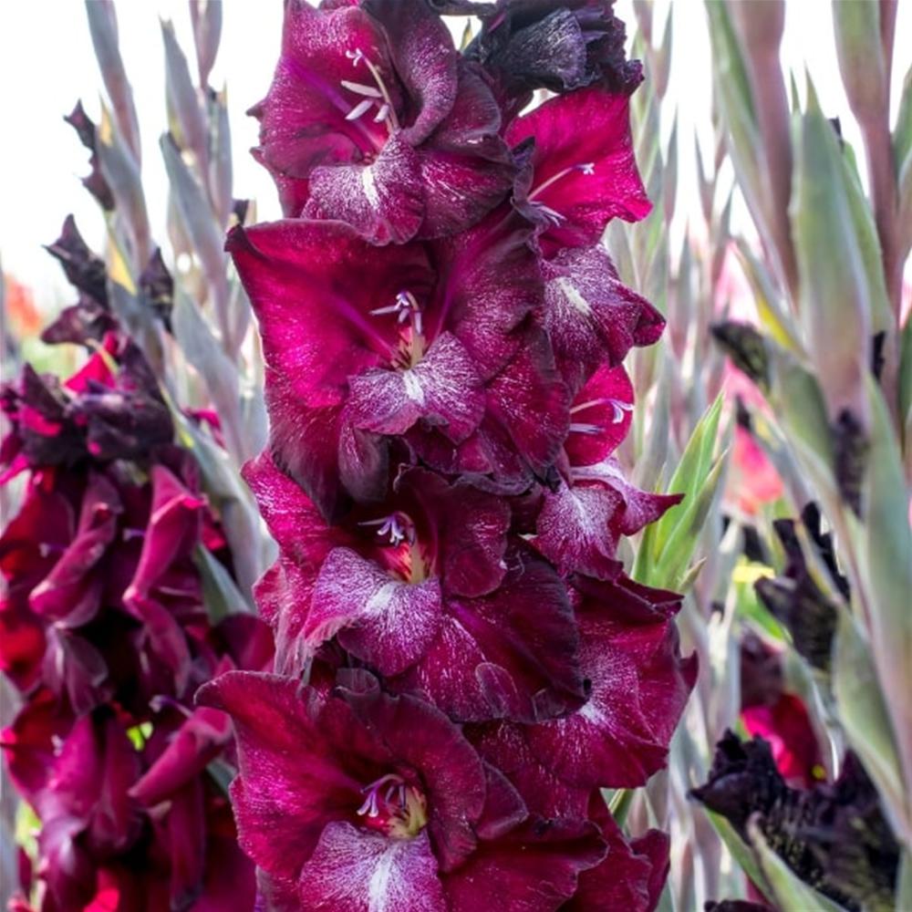 Gladiolus Royal Flame is prized for its tall. elegant spikes and richly coloured near-black blooms with subtle red-purple highlights. Flowering reliably from late summer to autumn. it brings drama and sophistication to borders. containers. and cut-flower arrangements. making it a striking and memorable addition to any garden.