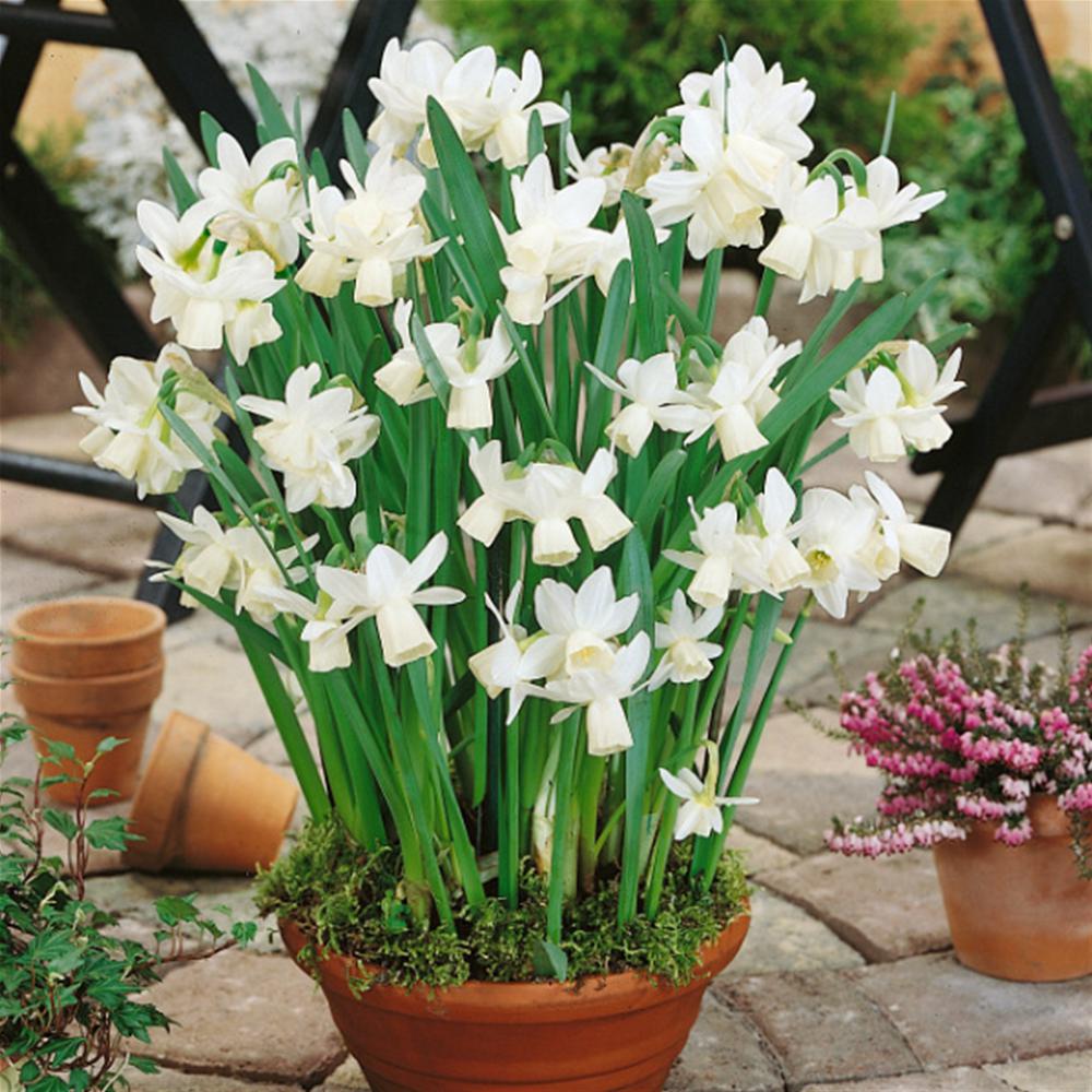 Introduce a touch of pure elegance to your spring garden with Narcissus 'Thalia'. This award-winning variety features multiple delicate, snow-white flowers per stem, gently nodding with a subtle fragrance. Known for its refined beauty and timeless appeal, 'Thalia' is a classic choice for creating serene and sophisticated displays. Blooming in mid to late spring, Thalia performs beautifully in borders, under trees, naturalised areas, or containers. Its dainty, star-shaped flowers also make excellent cut blooms for indoor arrangements.